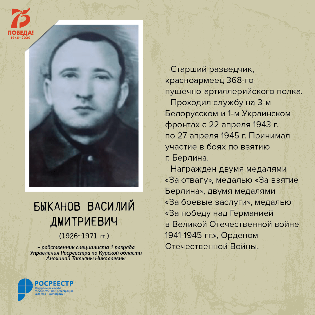 Более 400 фотографий с краткими биографиями военнослужащих появились на сайте Росреестра в разделе «Лица Победы». Среди них – и уроженцы Курского края: Василий Дмитриевич Быканов, Иван Тимофеевич Гладких, Мария Григорьевна Гладких, Филипп Иванович Давыденко, Моисей Максимович Иванов, Степан Тимофеевич Казанцев, Василий Свиридонович Малофеев, Василий Петрович Мельников.